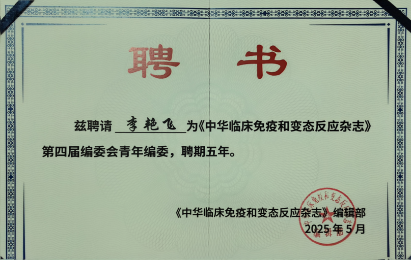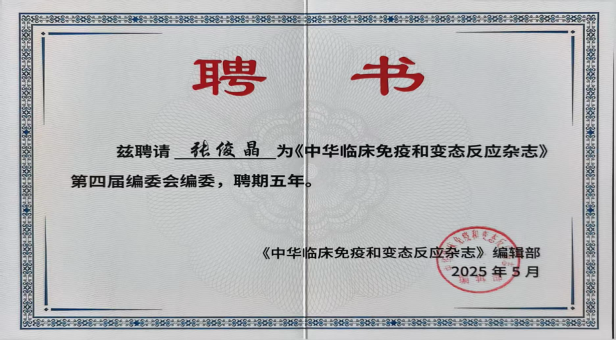 重磅!张俊晶、李艳飞教授分别荣聘《中华临床免疫和变态反应杂志》编委与青年编委