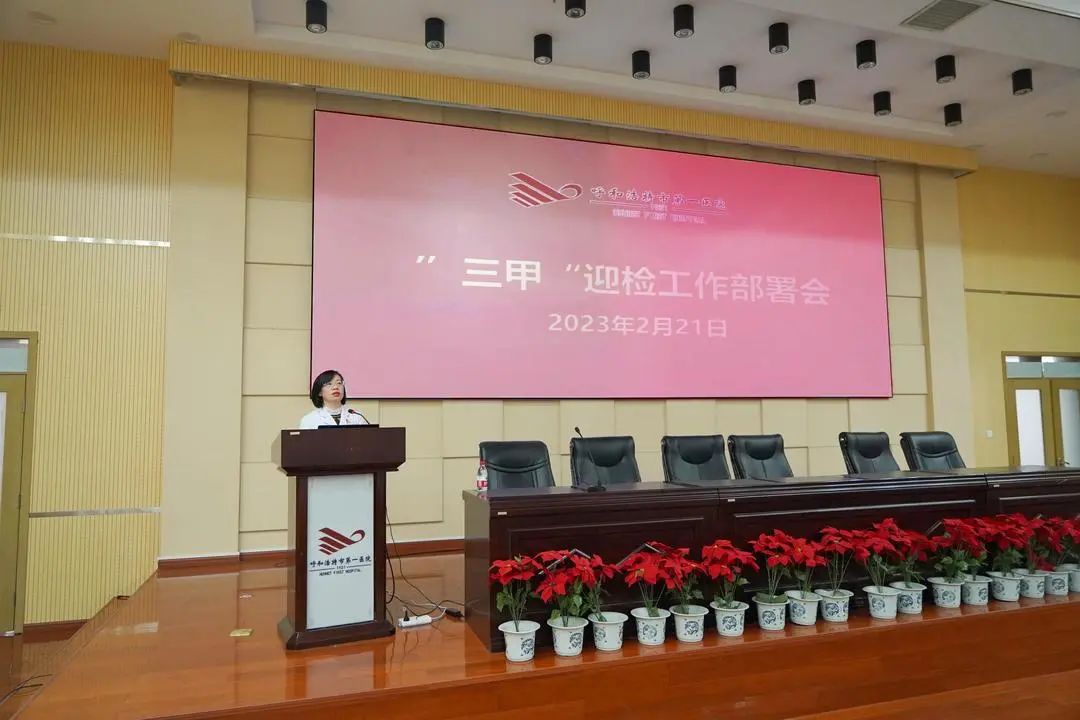 为进一步推进我院“三甲”创建工作,顺利迎接2月25-26日自治区卫健委医院评审专家组对我院的现场检查,2023年2月21日,呼和浩特市第一医院召开“三甲”迎检工作部署会,全体院领导班子成员、各科室主任、护士长、迎评管理员、迎评记录员参加会议。