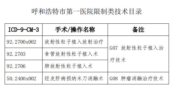 为进一步加强医疗技术临床应用管理,规范放射性粒子植入治疗技术及肿瘤消融治疗技术临床应用,保障医疗质量和医疗安全,根据《国家限制类技术临床应用管理规范(2022年版)》的规定,结合医院实际情况,对医院限制类技术目录,进现将调整后的《呼和浩特市第一医院限制类技术目录》公示。