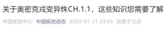 1月31日,中国疾病预防控制中心微信公众号发布《关于奥密克戎变异株CH.1.1,这些知识您需要了解》一文,就奥密克戎变异株CH.1.1相关热点问题作出解读。全文如下。
