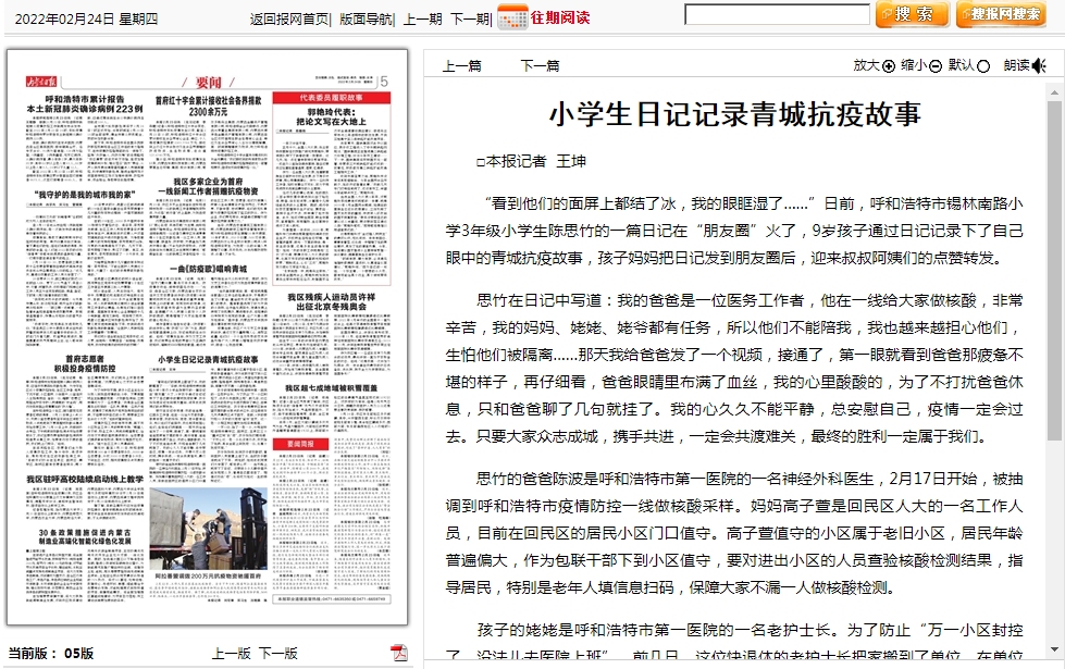 近期,一名小学生的日记“火”遍朋友圈,日记记录了青城抗疫的故事。日记中写道:“我的爸爸是一位医务工作者,他在一线给大家做核酸,非常辛苦,我的妈妈、姥姥、姥爷都有任务,所以他们不能陪我,我也越来越担心他们,生怕他们被隔离……那天我给爸爸发了一个视频,接通了,第一眼就看到爸爸那疲惫不堪的样子,再仔细看,爸爸眼睛里布满了血丝,我的心里酸酸的,为了不打扰爸爸休息,只和爸爸聊了几句就挂了……”,这位“爸爸”就是陈波。