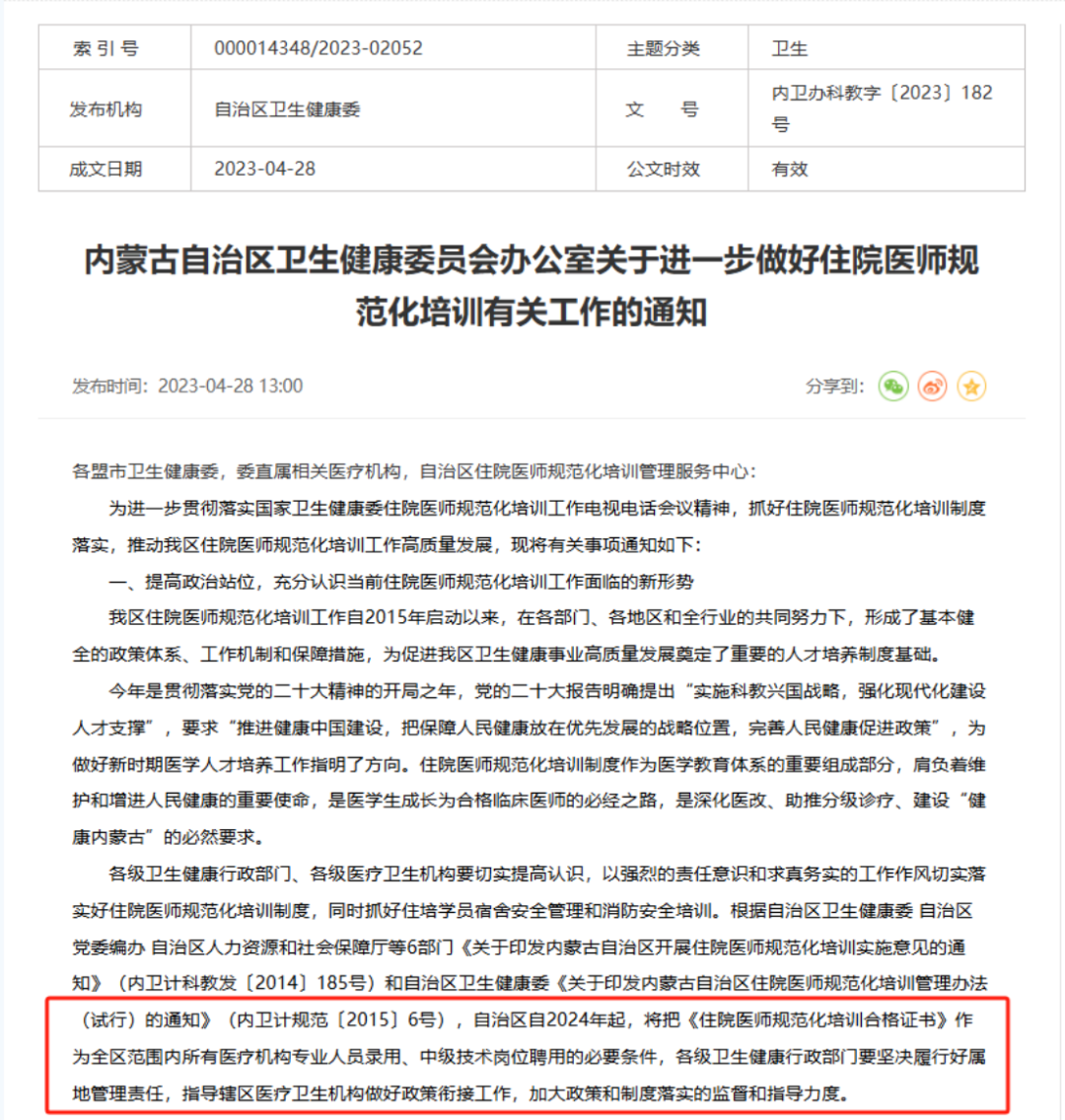 (二)2024年起,《住院医师规范化培训合格证书》作为全区范围内所有医疗机构专业人员录用、中级技术岗位聘用的必要条件。