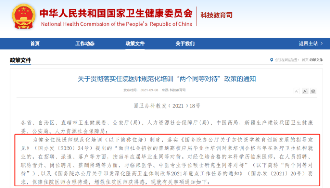 (一)在《关于贯彻落实住院医师规范化培训“两个同等对待”政策的通知》(国卫办科教发﹝2021﹞18号)中明确指出:面向社会招收的普通高校应届毕业生培训对象培训合格当年在医疗卫生机构就业的,在招聘、派遣、落户等方面,按当年应届毕业生同等对待。对经住培合格的本科学历临床医师,在人员招聘、职称晋升、岗位聘用、薪酬待遇等方面,与临床医学、中医专业学位硕士研究生同等对待。