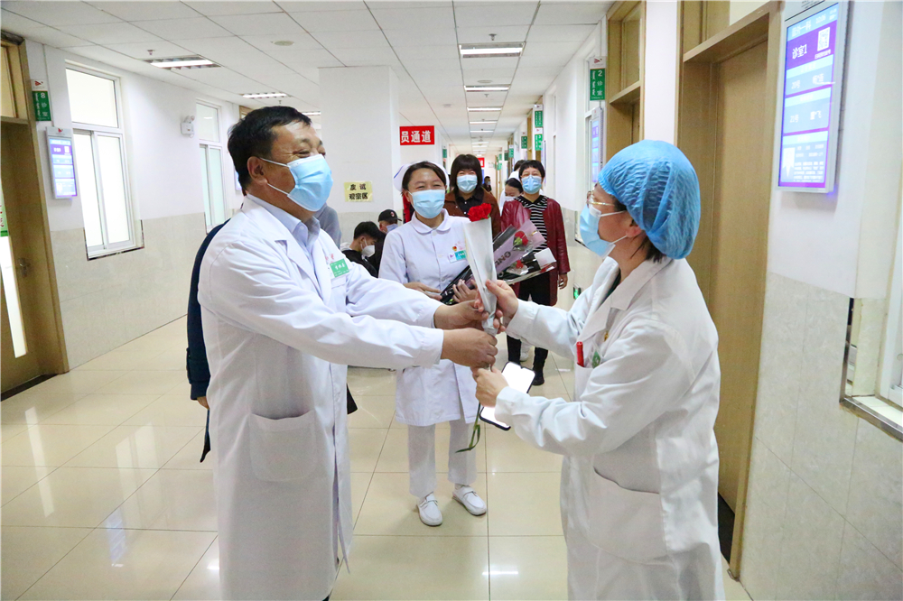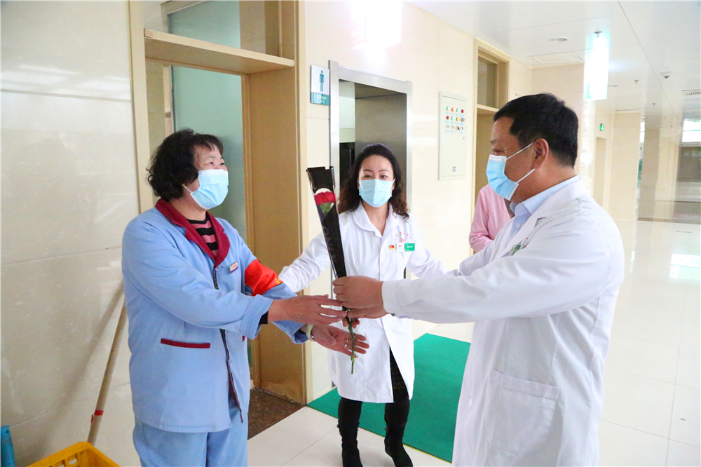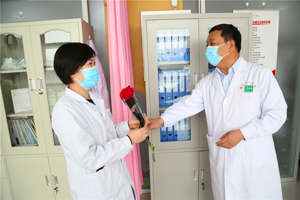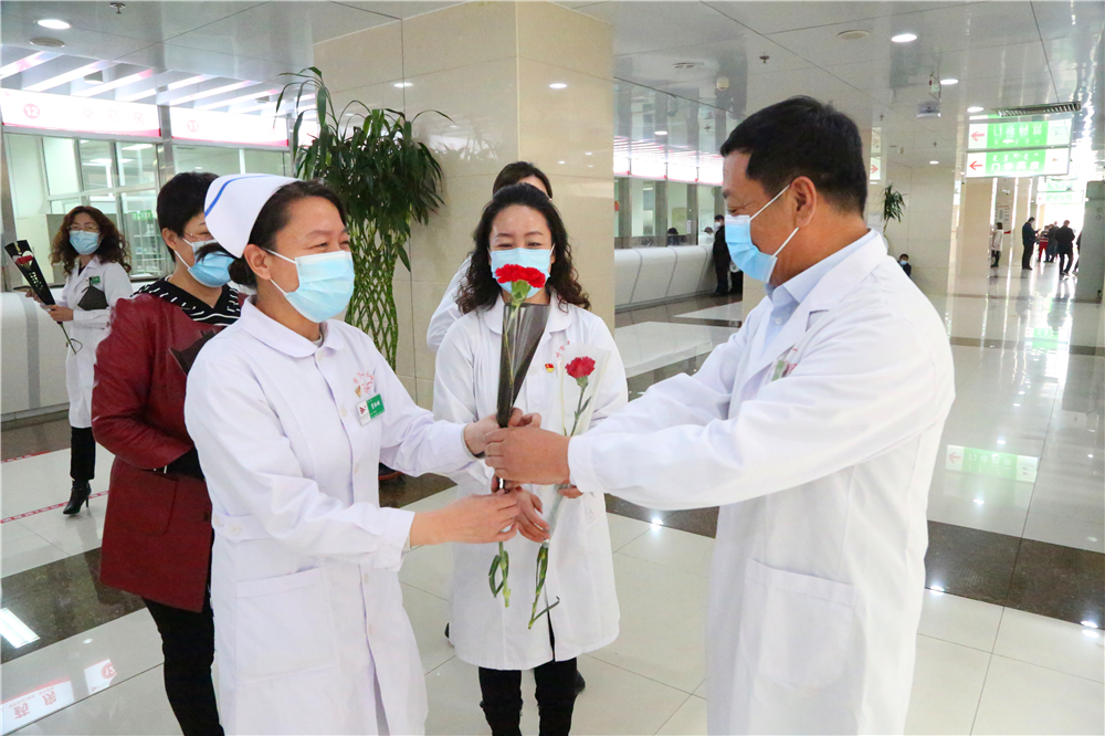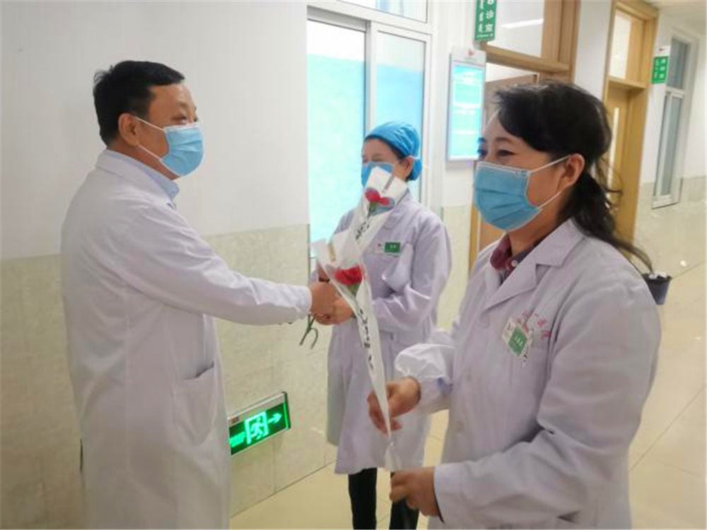 为庆祝“三八”国际妇女节,激励医务人员的工作热情,体现我院对医务工作者的关爱与重视,2021年3月8日上午9:30,门诊部工会小组牵头,党委书记李恒善和工会主席嘎勒登玛代表院领导,为门诊各科室的医务人员及现场的女性患者朋友们,送来了鲜花和节日的祝福与问候,大家感受到了领导的热情与关爱,在这个充满温暖与爱的医院里工作、就医,是一件多么幸福的事儿啊!