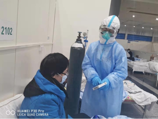 就这样,她成为武汉方舱医院抗击疫情医疗队中的一员。还记得第一天进到方舱医院,映入眼帘的场景让她感到非常迷茫与不安,一连串的大通铺、物品的不齐全,让马上就要上班的她感到有些担忧,但是她在心里对自己说“勇敢一点,不要害怕,只要自己有信心,就一定能战胜心中的恐惧,一定能战胜疫情,虽然我年纪比较小,但不能成为大家的负担。”经过反复的磨炼,小小年纪的她也可以迅速高效地完成手中的各项任务。无论是量体温,还是打针送药,她都将每一位患者当作自己的亲人,温暖以待。记得刚到方舱医院的时候,一位50多岁的轻症患者入院时心情很不好,为了能让他把心态调整过来,只要是她的班次,都会多关注他的情况,嘘寒问暖,她知道所有的患者来到这个陌生的大环境,内心多多少少都会有一点害怕,经过几天的治疗,这位患者的身体和情绪都在一步步好转。出院时,患者感激地说,“姑娘,是你们给了我新生,希望好人一生平安,你们都能早日平安回家!”患者朴实的话语让她感动泪目,也给了她更大的信心。