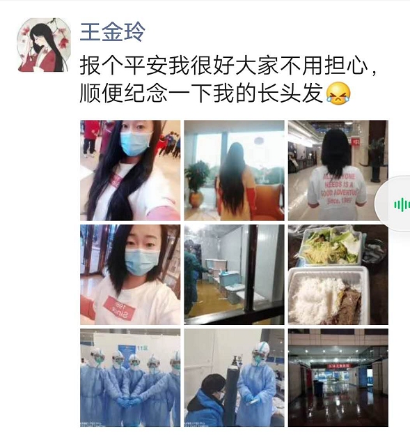 2月4日当晚到达武汉后,握着剪刀站在镜子前,盯着自己留了八年的及腰长发,最终还是不忍心下手,回想这几年来,为了养这一头长发,从不舍得烫、不舍得染,极尽努力地保护着。“为了安全,头发必须剪短”,锡盟中心医院老师的一句话打断了她的思绪,说完就拿起剪刀一寸一寸地剪下她的长发。那一刻,两个人的内心都是酸楚的。