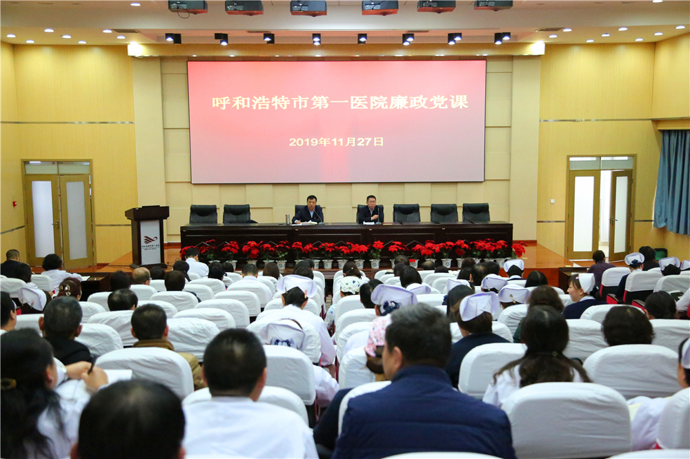 为贯彻落实党的十九大精神,深入开展“不忘初心、牢记使命”主题教育活动,加强党风廉政建设,强化环节干部廉洁自律意识,提升作风和能力素质,呼和浩特市第一医院于2019年11月27日召开廉政党课,党委委员、领导班子成员、纪委委员,科室主任、副主任、负责人、护士长,财务科、总务科、动力科、基建科、药剂科、器械科、伙食管理科的各班(组)长,各党支部书记、委员及团委书记、团支部书记,共计200余人参加了会议。