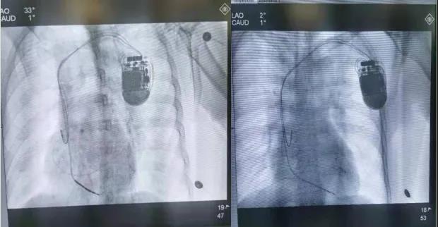 患者,男,64岁,10年前因急性心肌梗死在外院行急诊PCI植入支架一枚,2021年7月出现胸憋、心悸,伴肩背部疼痛及咽喉部紧缩感,就诊于我院行心电图检查示室性心动过速,给予抗心律失常药物无效,电复律后恢复窦性心律。2021年11月11日再发室性心动过速于我院急诊科电复律转窦后转入我科。室性心动过速是心肌梗死后常见的恶性心律失常,极易发展成室扑、室颤,可危及生命,是心源性猝死的主要原因。鉴于患者反复出现恶性心律失常,猝死风险高,入院后科室高度重视,开展疑难危重病历讨论,并向侯煜院长及高江峰主任汇报患者病情。患者反复多次出现室性心动过速,且心彩超提示心脏扩大,左室射血分数明显降低,BNP明显升高,患者已出现明显心力衰竭表现,药物治疗效果差,心电图QRS波明显增宽,猝死风险极高,经过与患者及家属的多次沟通,经过综合分析及充分论证,决定为患者安装CRT-D,手术历时1小时40分钟,圆满成功。在既往CRT-D手术基础上,进一步改进和优化。本次手术使用先进的DF4除颤导线和Quartet左室四极导线,DF4除颤导线配合三合一除颤端口,将传统CRT-D的8颗螺丝减至3颗,缩短了手术时间,有效减小囊袋体积,降低感染风险,左室四极导线,可从10个向量测试左室起博阈值,增强恶性心律失常的识别,提升了CRT-D除颤及起博功能的有效性及安全性,有效降低患者猝死的风险。术后患者心电图QRS波宽度明显缩小,患者心衰症状明显改善,仅在患者胸部留有一处小切口,切口愈合良好,未出现切口感染。患者及家属对手术非常满意。