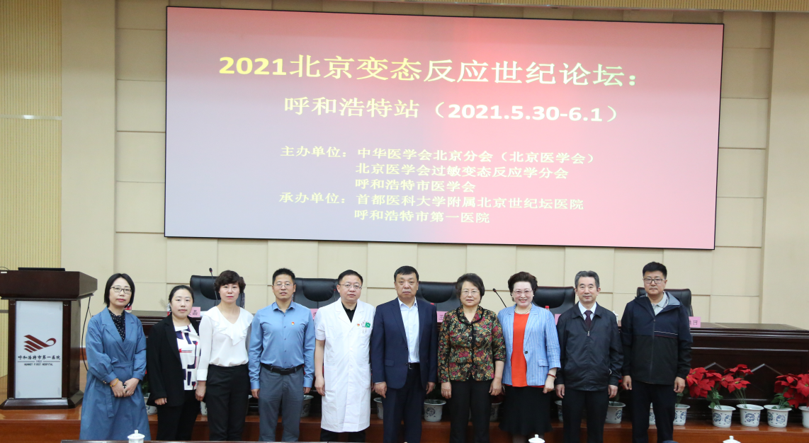 2021北京变态反应世纪论坛呼和浩特站(2021.5.30-6.1)于2021年5月30日在呼和浩特巿第一医院行政三楼会议室隆重召开。本次会议由中华医学会北京分会(北京医学会)、北京医学会过敏变态反应学分会、呼和浩特市医学会主办,由首都医科大学附属北京世纪坛医院、呼和浩特市第一医院承办。参加本次论坛的有北京三位知名专家王学艳教授、马琳教授、王洪田教授 ,呼和浩特市各兄弟医院的专家及我院在家院领导、各临床科室主任、护士长共120余人。