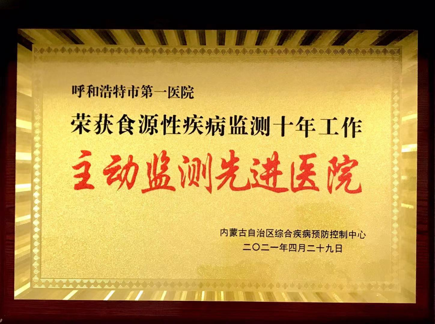 2021年4月29日,在自治区公共卫生技术培训会议上,呼和浩特市第一医院被内蒙古自治区综合疾病预防控制中心评为食源性疾病监测十年工作主动监测先进医院,感染管理科王继凤同志被评为食源性疾病监测十年工作先进个人,分别受到表彰。