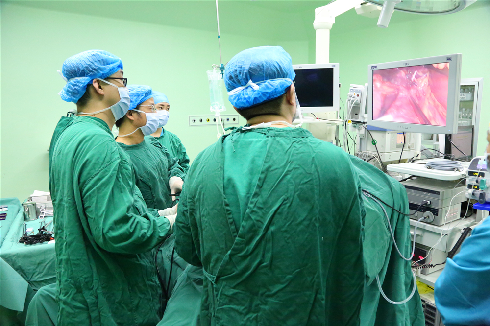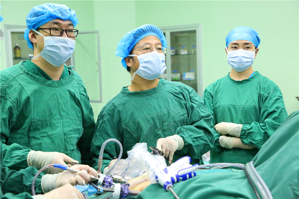 我院既往先天性胆总管囊肿行开腹手术,手术为四级高难度手术。在张俊晶副院长带领下,在全腹腔镜下完成胆管囊肿切除及胆管空肠吻合,空肠侧侧吻合。手术时间270分钟,出血量约50ml,手术顺利,此项手术在内蒙古自治区外科领域达到领先水平。