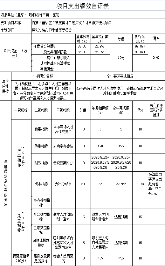 根据年初设定的绩效目标,项目自评得分99.96分。全年预算数为33万元,执行数为32.956万元,完成预算的99.87%。项目绩效目标完成情况:为推动构建“一心多点”人才工作新格局,搭建高层次人才与产业项目对接平台,充分激发人才创新创业活力,吸引更多海内外高层次人才聚集内蒙古,举办两场高层次人才合作交流会。发现的主要问题及原因:无。下一步改进措施:无。