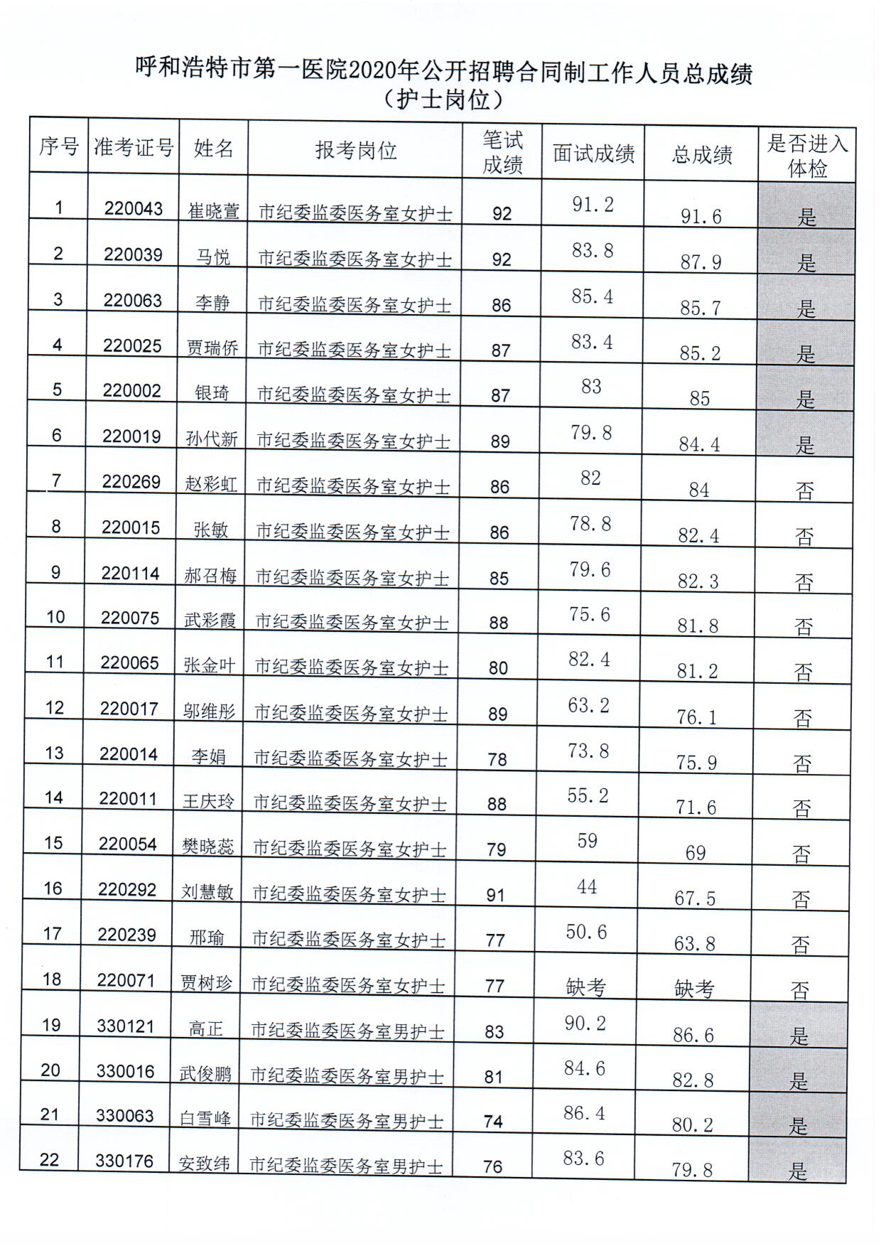 呼和浩特市第一医院2020年公开招聘合同制护士岗位总成绩公示