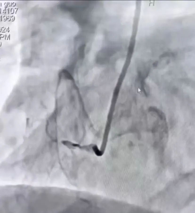 当时患者无法平卧,呈端坐位状态,因休克导致精神呈紧张、躁狂状态,随时可能因日常的一个简单动作加重心源性休克症状、诱发严重的心律失常导致死亡,完全没有办法配合手术治疗,患者命悬一线。但是在与患者家属沟通的过程中,家属治疗意愿十分积极。随后高江峰主任当机立断,联系麻醉科准备全麻下行心内科介入手术治疗,为患者争取一线生机,争取上手术台的机会。除此之外,在上台之前给予患者植入主动脉内球囊反搏(IABP),行深静脉置管术以备用临时起搏器通路,为患者的救治之路保驾护航。