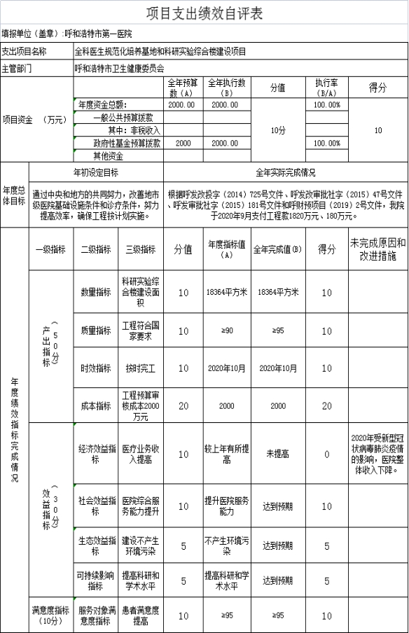 根据年初设定的绩效目标,项目自评得分90分。全年预算数为2000万元,执行数为2000万元,完成预算的100%。项目绩效目标完成情况:通过中央和地方的共同努力,改善地市级医院基础设施条件和诊疗条件,努力提高效率,确保工程按计划实施。发现的主要问题及原因:设定目标时,希望通过加强医院科研水平,带动医院医疗收入,但2020年受新冠肺炎疫情的影响,医院整体收入下降。下一步改进措施:2021年疫情虽然还会不定时小范围爆发,但希望通过严格的防控工作,做到竟然有条,在防控疫情的同时增加医院的收入水平。