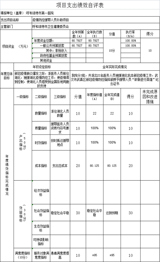 根据年初设定的绩效目标,项目自评得分100分。全年预算数为80.7827万元,执行数为80.7827万元,完成预算的100%。项目绩效目标完成情况:新冠疫情肺炎爆发之际,派医务人员前往湖北,驰援湖北疫情防控工作,使疫情等到控制,使湖北人民感受到全国各地同胞的支持。我院分三批,共派出22名医务人员驰援湖北抗击新冠疫情工作,武汉市武昌区新冠疫情防控指挥部授予援鄂人员“致敬逆行英雄”纪念证书。发现的主要问题及原因:无。下一步改进措施:无。
