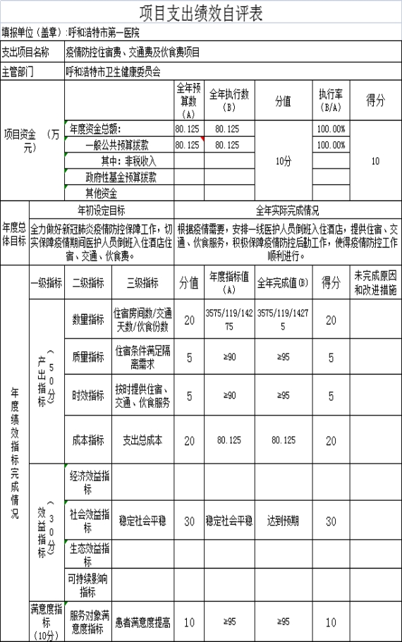 根据年初设定的绩效目标,项目自评得分100分。全年预算数为80.125万元,执行数为80.125万元,完成预算的100%。项目绩效目标完成情况:根据疫情需要,安排一线医护人员倒班入住酒店,提供统一住宿、交通、伙食服务,积极保障疫情防控后勤工作,使得疫情防控工作顺利进行。发现的主要问题及原因:无。下一步改进措施:无。