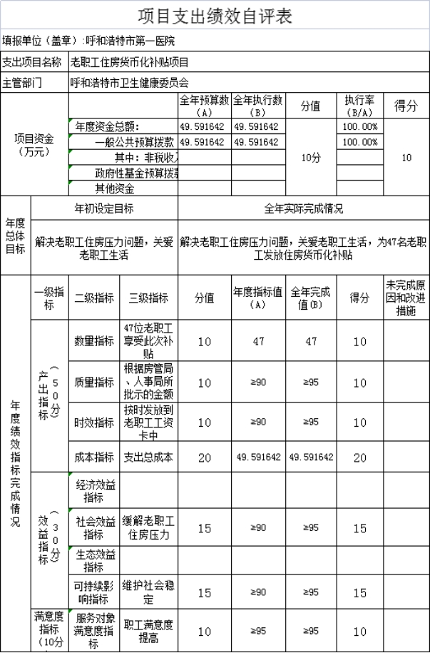 根据年初设定的绩效目标,项目自评得分100分。全年预算数为49.591642万元,执行数为49.591642万元,完成预算的100%。项目绩效目标完成情况:解决老职工住房压力问题,关爱老职工生活,为47名老职工发放住房货币化补贴。发现的主要问题及原因:无法为全部未兑现住房补贴的职工一次性解决问题,因为需要房管局的工作人员一个一个核实每位职工的住房情况。下一步改进措施:加大工作力度,全力解决剩余老职工未取得住房货币化补贴的问题。