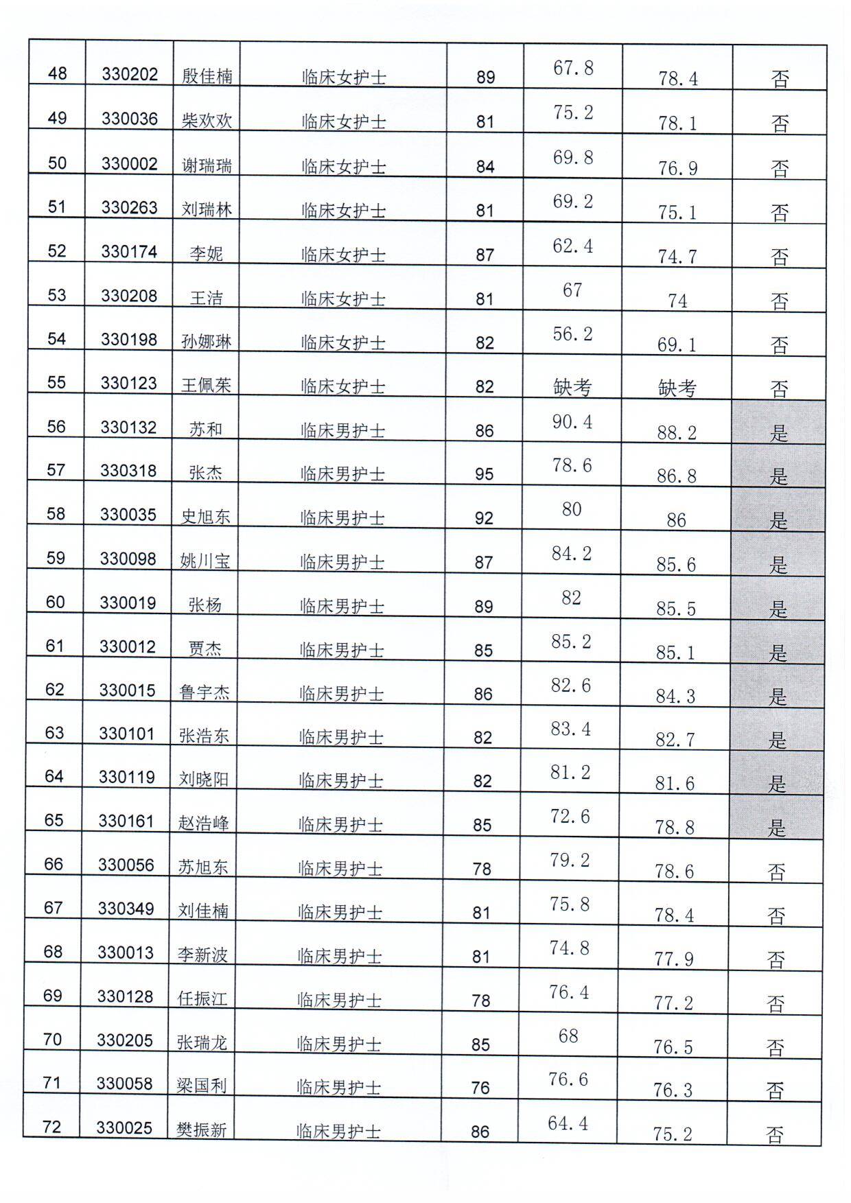 现将呼和浩特市第一医院2020年公开招聘合同制工作人员中市纪委监委医务室男护士、市纪委监委医务室女护士、临床男护士、临床女护士岗位总成绩公示如下,请报考人员及时登陆网站查询。成绩公示为期5天(包含公休日)。