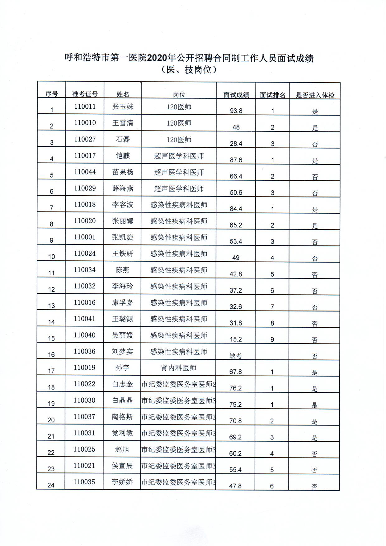 呼和浩特市第一医院2020年公开招聘合同制医师、药剂师岗位面试成绩公示